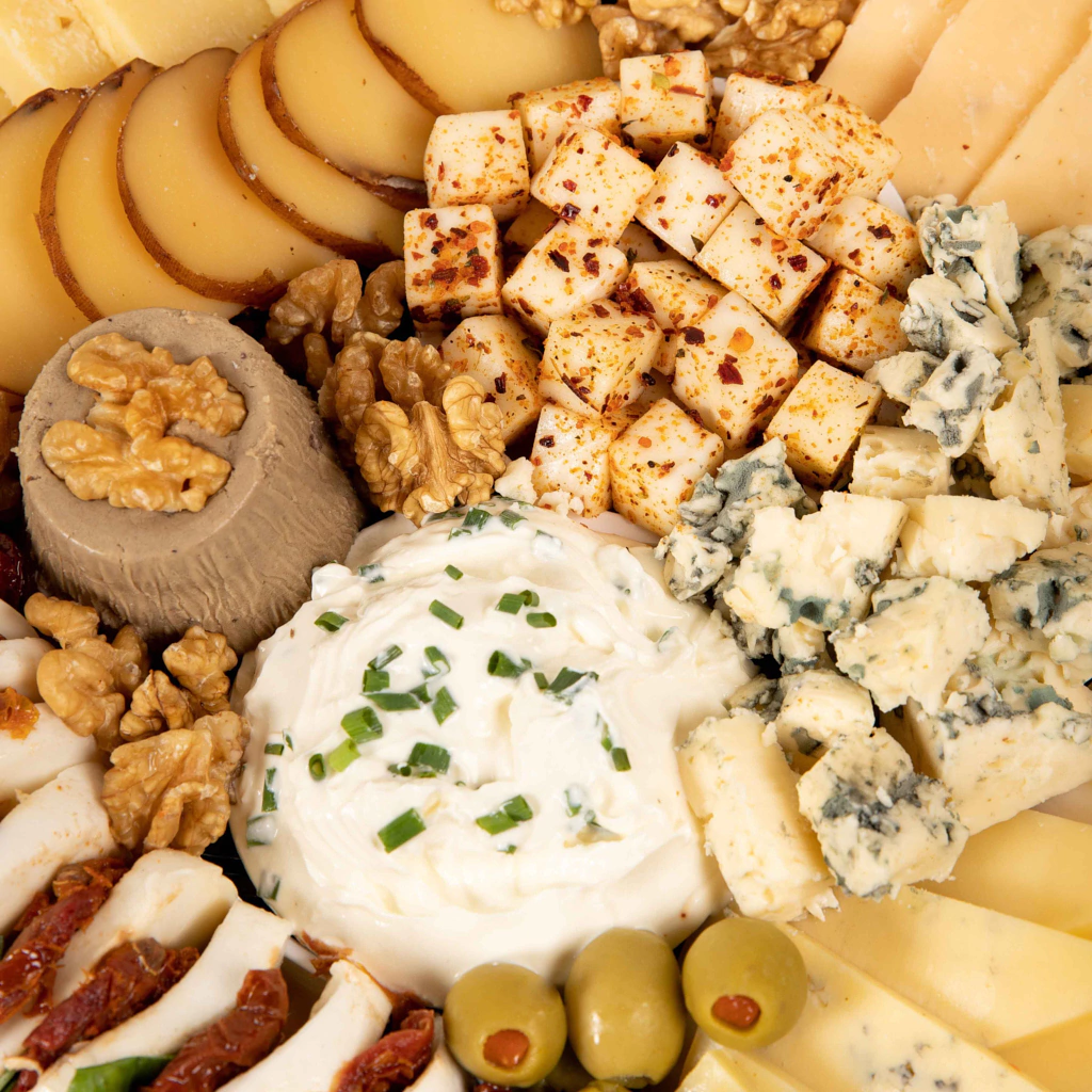 Emmental, Fior Di Latte con Tomates Secos, Comté, Mini Camembert, Semi Duro de Cabra, Canestrato con Pimienta, Farcell, Cheddar, Morbier, Azul Valenti, Feta Preparado, Paté de Ave al Champagne, Petite Suisse Alemán, Aceitunas verdes rellenas con morrón, Nueces Peladas, Damascos Turcos.