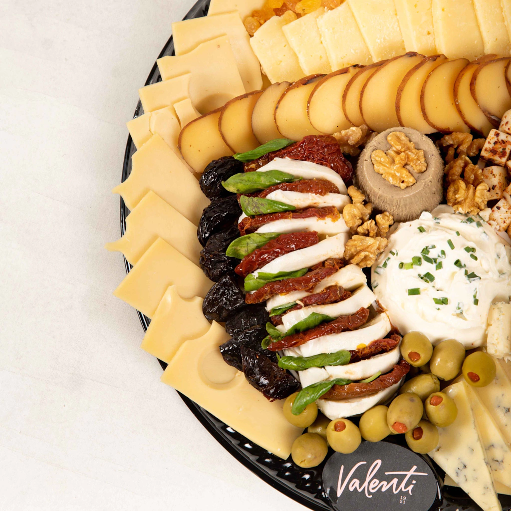 Gruyere Bola De Nieve, Fior Di Latte, Queso Gouda, Queso Val D‘aosta, Trenza Ahumada, Feta Preparado, Queso Azul, Parmesano al Aceto, Petit Suisse Alemán, Banquete de Tandil Condimentado, Corazones de Alcauciles, Aceitunas Verdes rellenas con Morrón, Aceitunas Negras descarozadas, Damascos, Nueces Peladas, Tomates Secos.